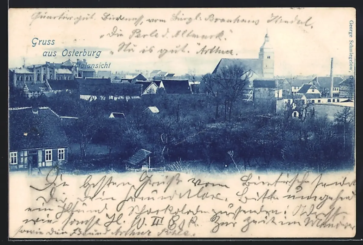 Personenbezogene Daten auf der Rückseite der Karte wurden durch blauen Textmarker unkenntlich gemacht. Die blauen Stellen sind auf die Vorderseite durchgeweicht und wirken sich negativ auf das Postkartenfoto aus