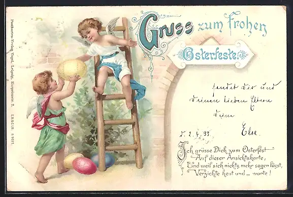 AK Osterengel auf einer Leiter, Ostereier