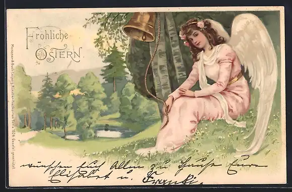 AK Osterengel mit Glocken in einem Birkenwäldchen