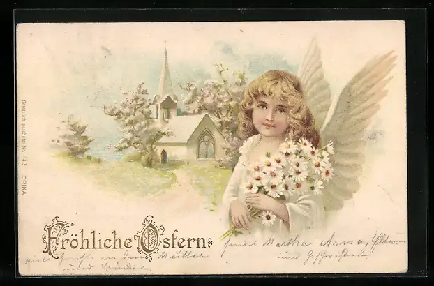 AK Osterengel mit Margeritenstrauss