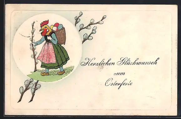 AK Ostergruss, Huhn trägt Korb mit Ostereiern auf dem Rücken