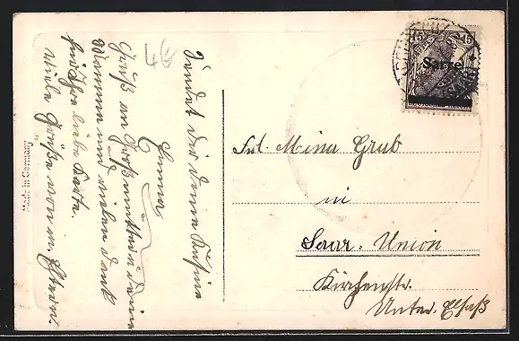 Personenbezogene Daten auf der Rückseite der Karte wurden durch blauen Textmarker unkenntlich gemacht. Die blauen Stellen sind auf die Vorderseite durchgeweicht und wirken sich negativ auf das Postkartenfoto aus