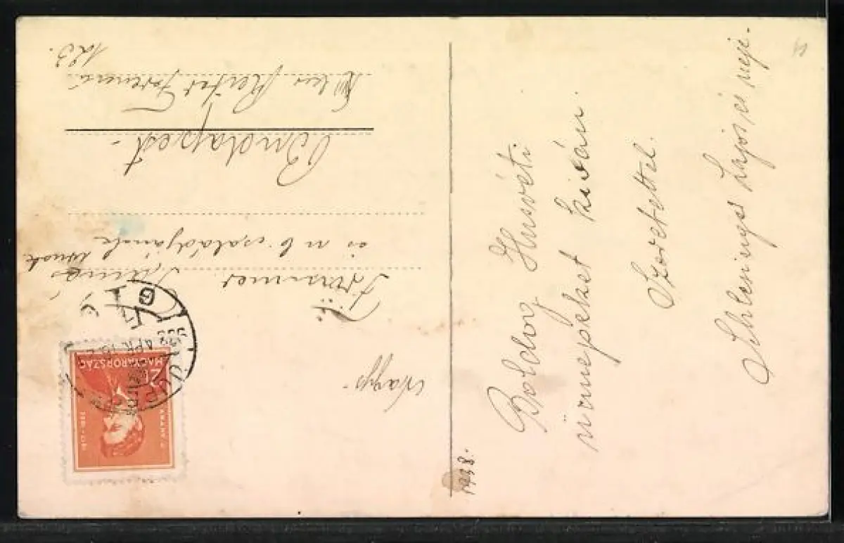 Personenbezogene Daten auf der Rückseite der Karte wurden durch blauen Textmarker unkenntlich gemacht. Die blauen Stellen sind auf die Vorderseite durchgeweicht und wirken sich negativ auf das Postkartenfoto aus