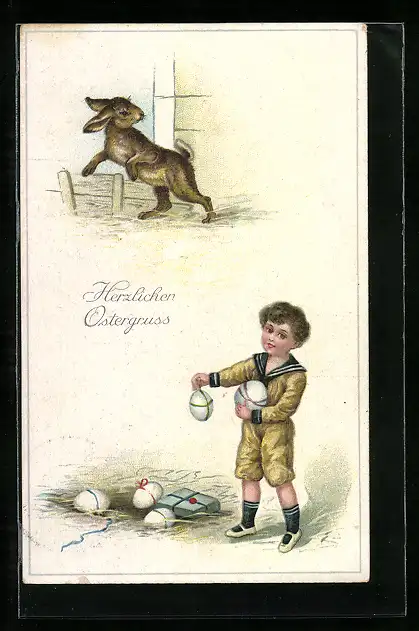 AK Osterhase hat Eier versteckt, Jüngling findet sie erfreut