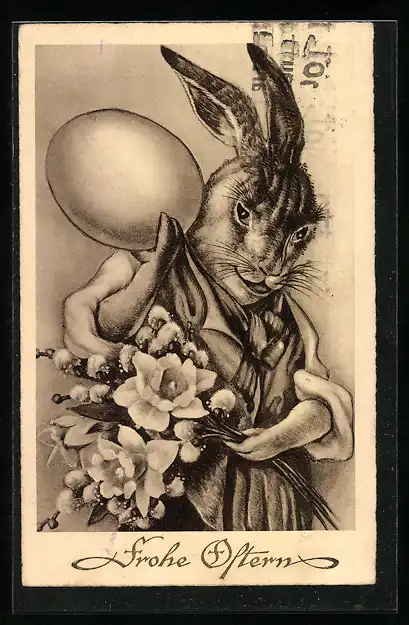 AK Osterhase mit Weidenkätzchen und grossem Ei auf der Schulter