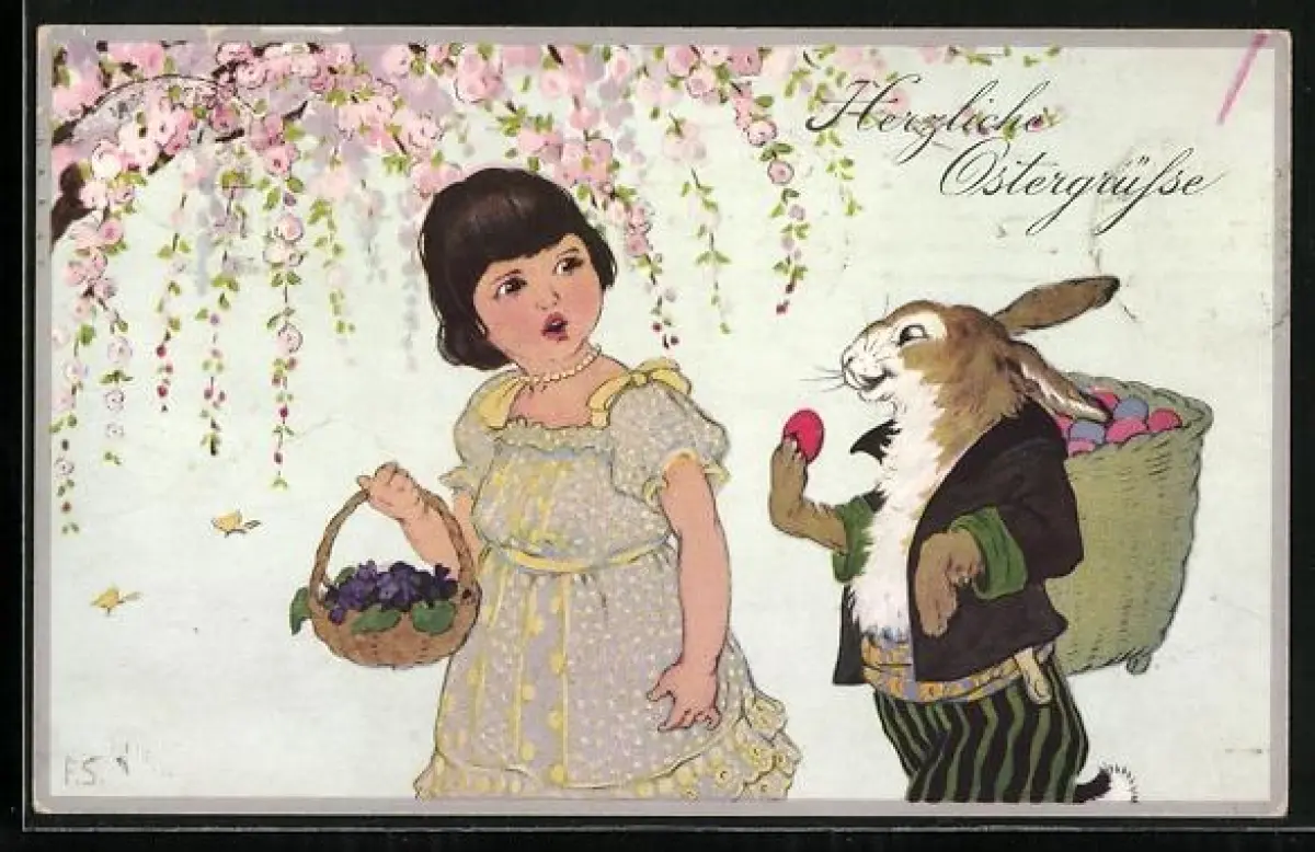 AK Osterhase mit einem Korb voller Ostereier redet mit einem Mädchen