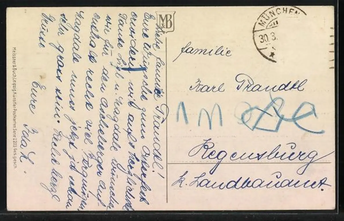 Personenbezogene Daten auf der Rückseite der Karte wurden durch blauen Textmarker unkenntlich gemacht. Die blauen Stellen sind auf die Vorderseite durchgeweicht und wirken sich negativ auf das Postkartenfoto aus