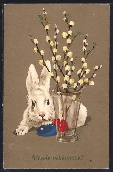 AK Osterhase neben Vase mit Weidenkätzchen