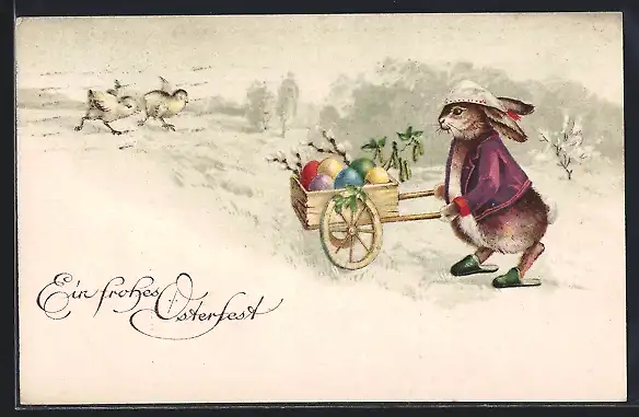AK Osterhase schiebt Schubkarre mit bunten Ostereiern