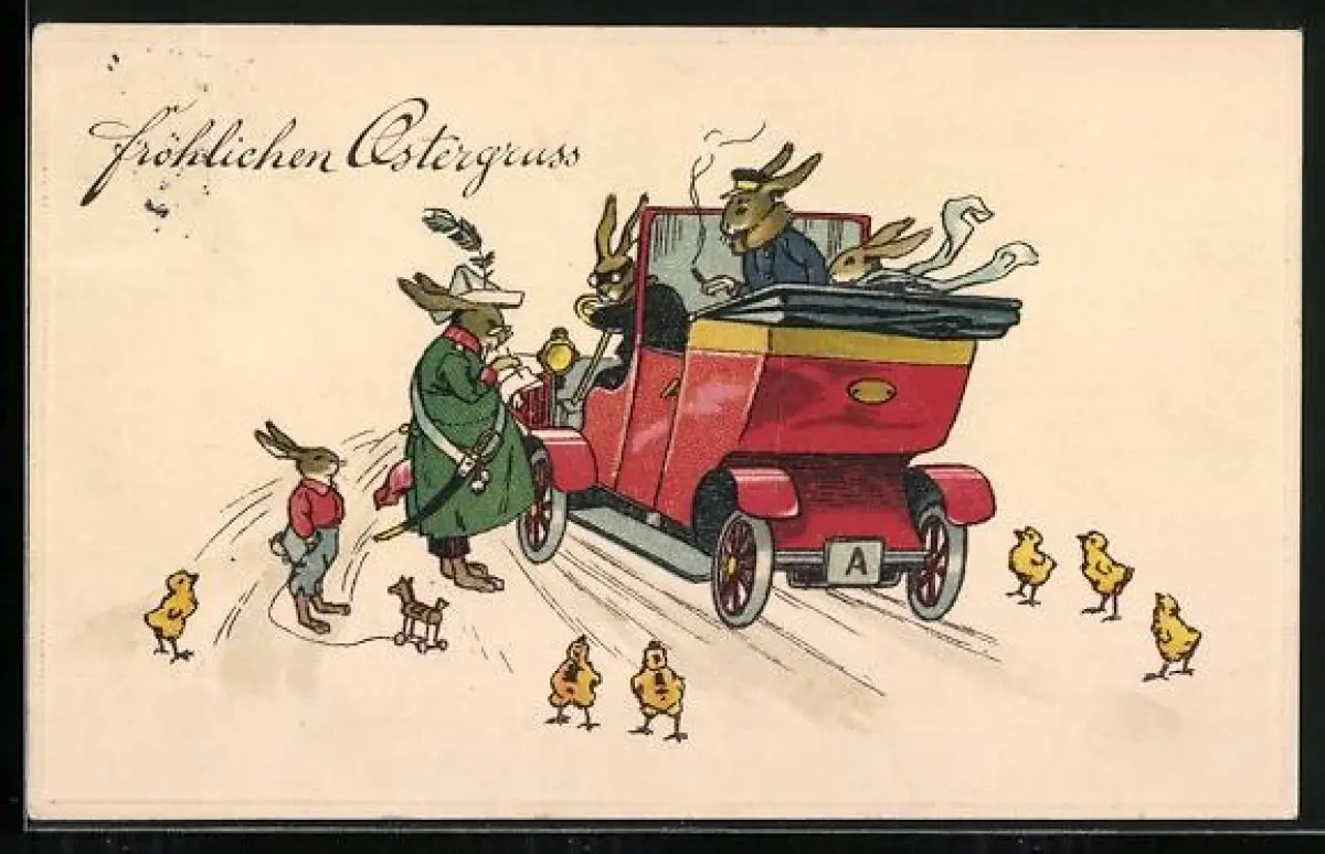 AK Osterhasen in einem Auto, Osterhasenpolizei schreibt Strafmandat, Herzlichen Ostergruss