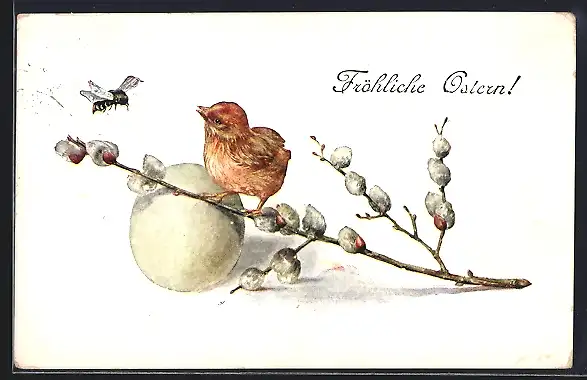 AK Osterküken auf Kätzchenzweig beobachtet Wespe, Ostergruss