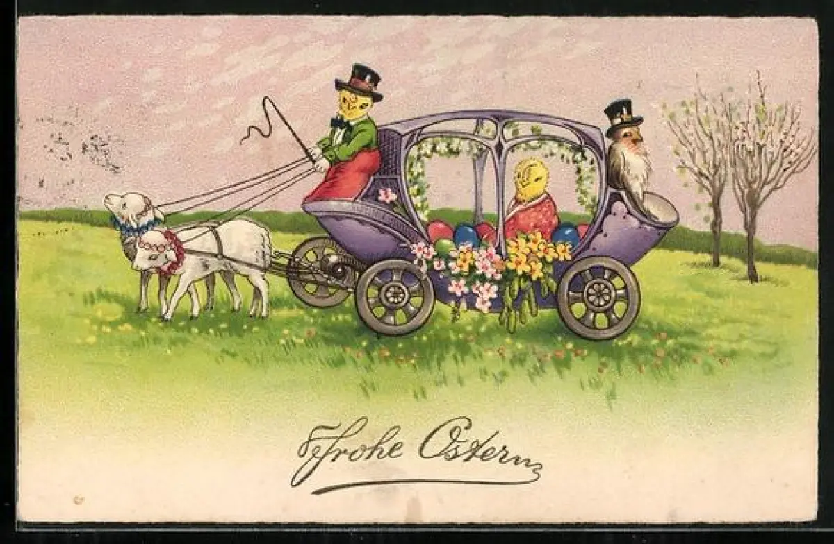 AK Osterküken in einer Kutsche, die von Lämmern gezogen wird, Frohe Ostern