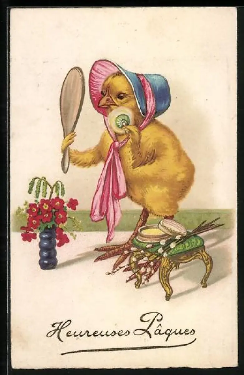 AK Osterküken mit Spiegel, Hereuses Paques