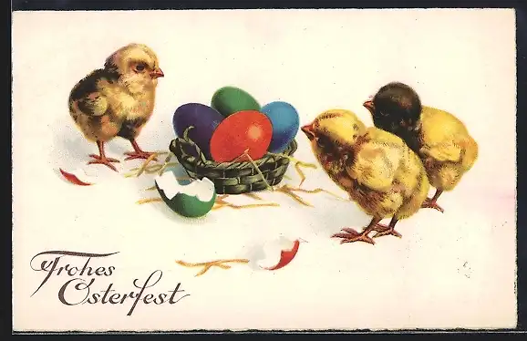 AK Osterküken mit bemalten Ostereiern in einem Korb