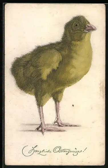 AK Osterküken steht vor hellem Hintergrund, Herzliche Ostergrüsse