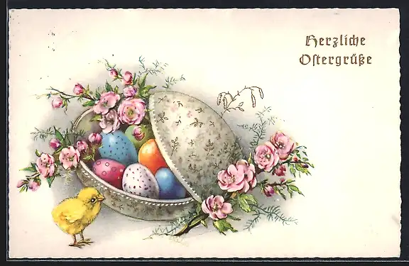 AK Osterküken vor Schale mit Ostereiern, Ostergruss