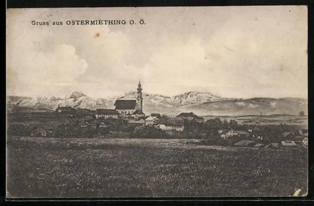 AK Ostermiething /O. Ö., Ortsansicht von einer Anhöhe aus