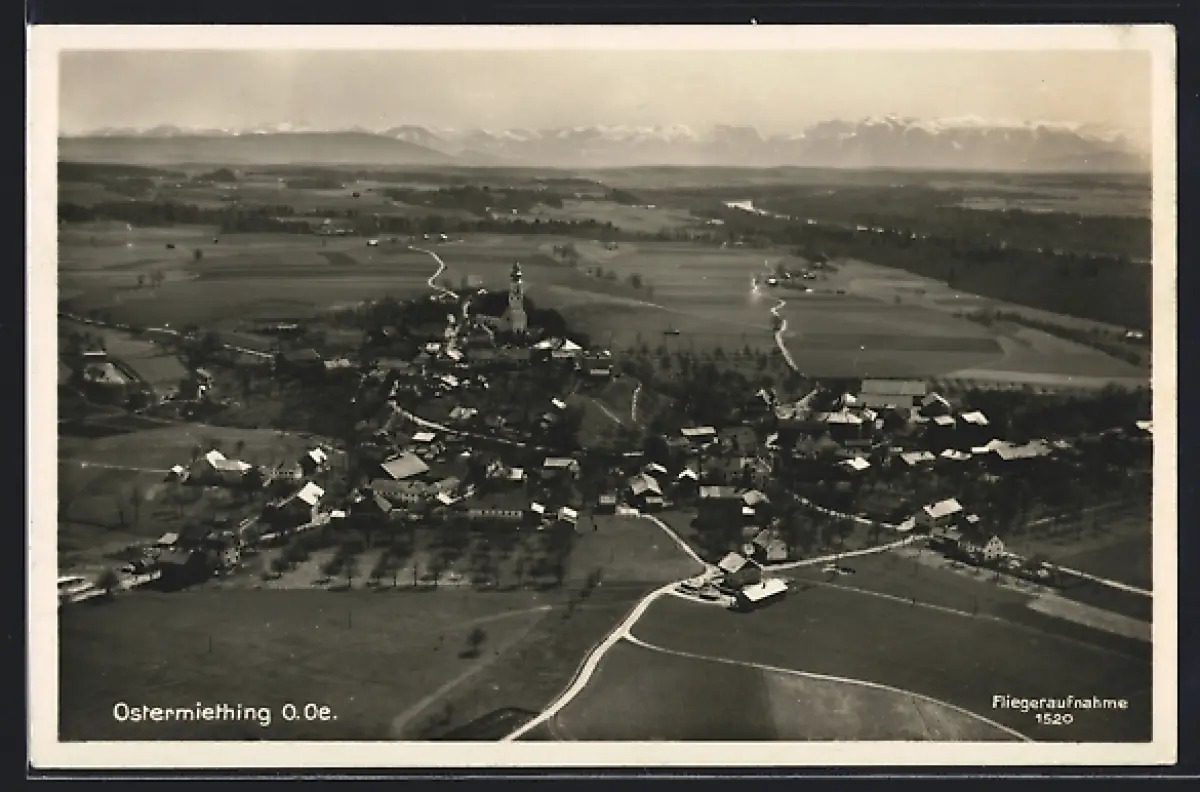 AK Ostermiething /O.-Oe., Teilansicht mit Kirche, Fliegeraufnahme