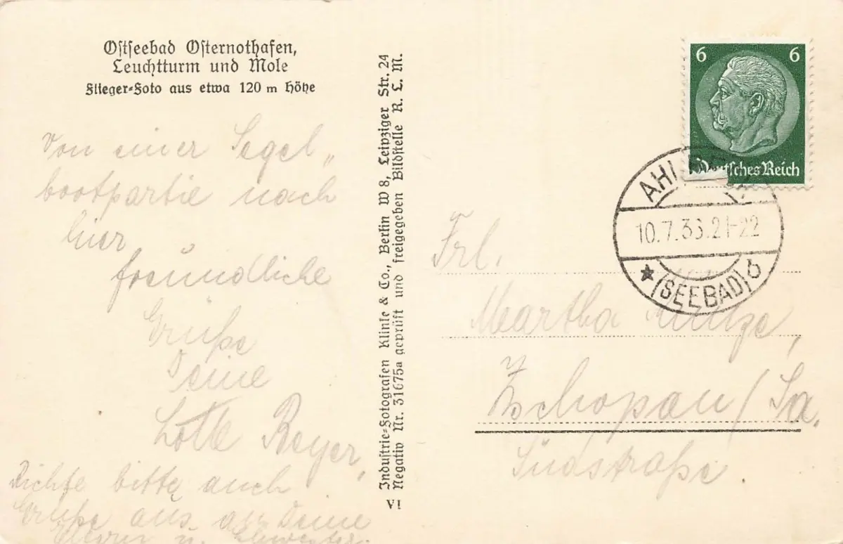 AK Osternothafen Fliegeraufnahme Leuchtturm Mole Pommern 1933 gelaufen Postkarte