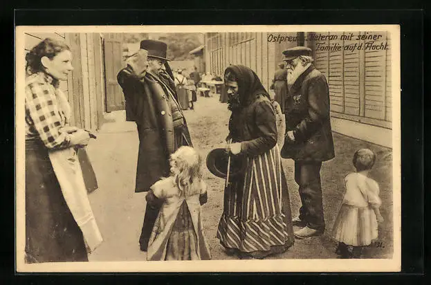 AK Ostpreussischer Veteran mit seiner Familie auf der Flucht, mit Orden an der Brust