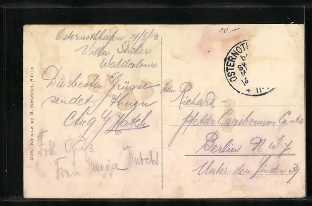 Personenbezogene Daten auf der Rückseite der Karte wurden durch blauen Textmarker unkenntlich gemacht. Die blauen Stellen sind auf die Vorderseite durchgeweicht und wirken sich negativ auf das Postkartenfoto aus