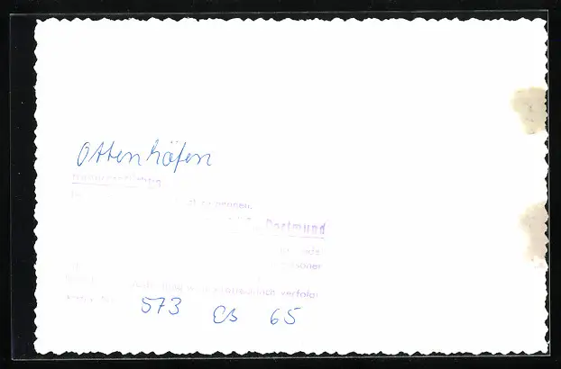 Personenbezogene Daten auf der Rückseite der Karte wurden durch blauen Textmarker unkenntlich gemacht. Die blauen Stellen sind auf die Vorderseite durchgeweicht und wirken sich negativ auf das Postkartenfoto aus