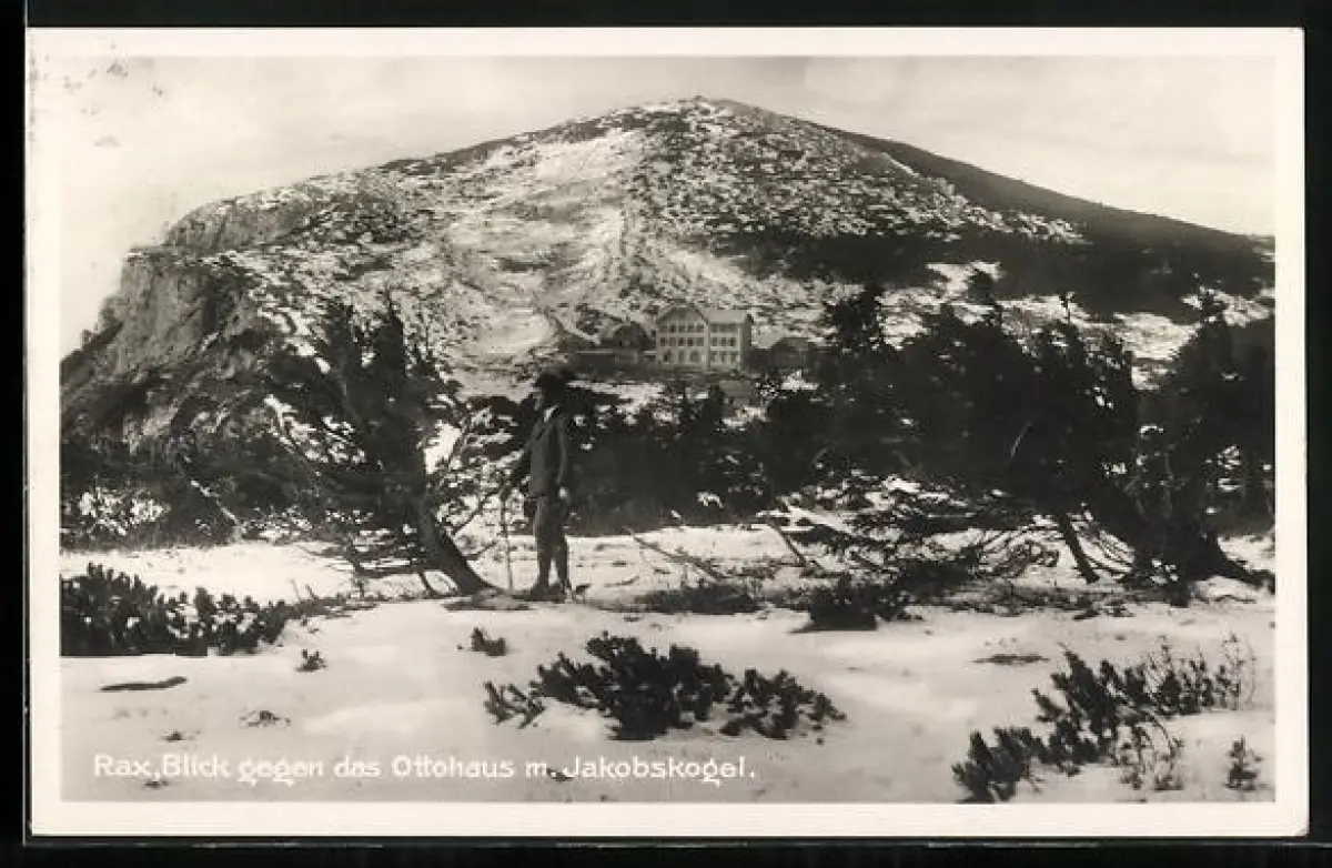 AK Ottohaus, Blick gegen die Berghütte mit Jakobskogel, Rax