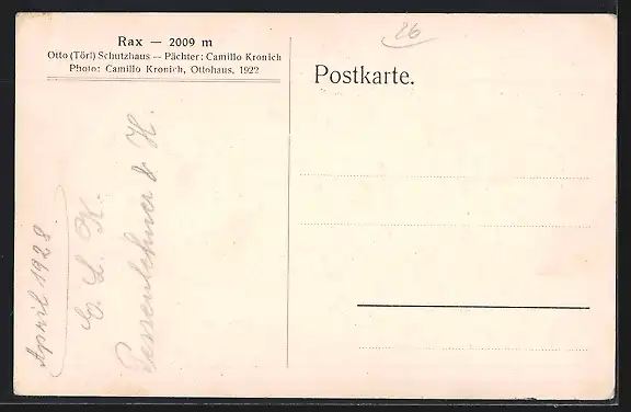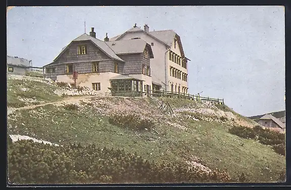 AK Ottoschutzhaus am Rax, Bes. Camillo Kronich, Ansicht vom Hang aus