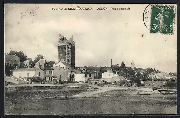 AK Oudon, Vue d`ensemble avec tour et maisons au bord de l`eau