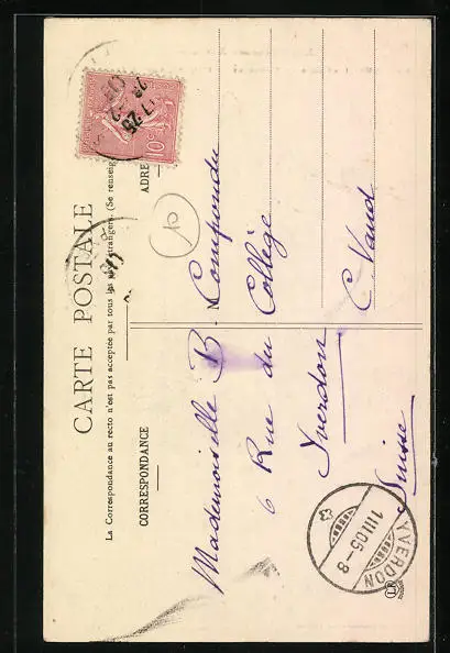 Personenbezogene Daten auf der Rückseite der Karte wurden durch blauen Textmarker unkenntlich gemacht. Die blauen Stellen sind auf die Vorderseite durchgeweicht und wirken sich negativ auf das Postkartenfoto aus