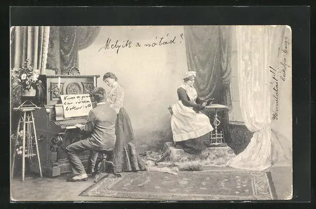 AK Paar am Klavier mit Dienstmädchen nebst Postament