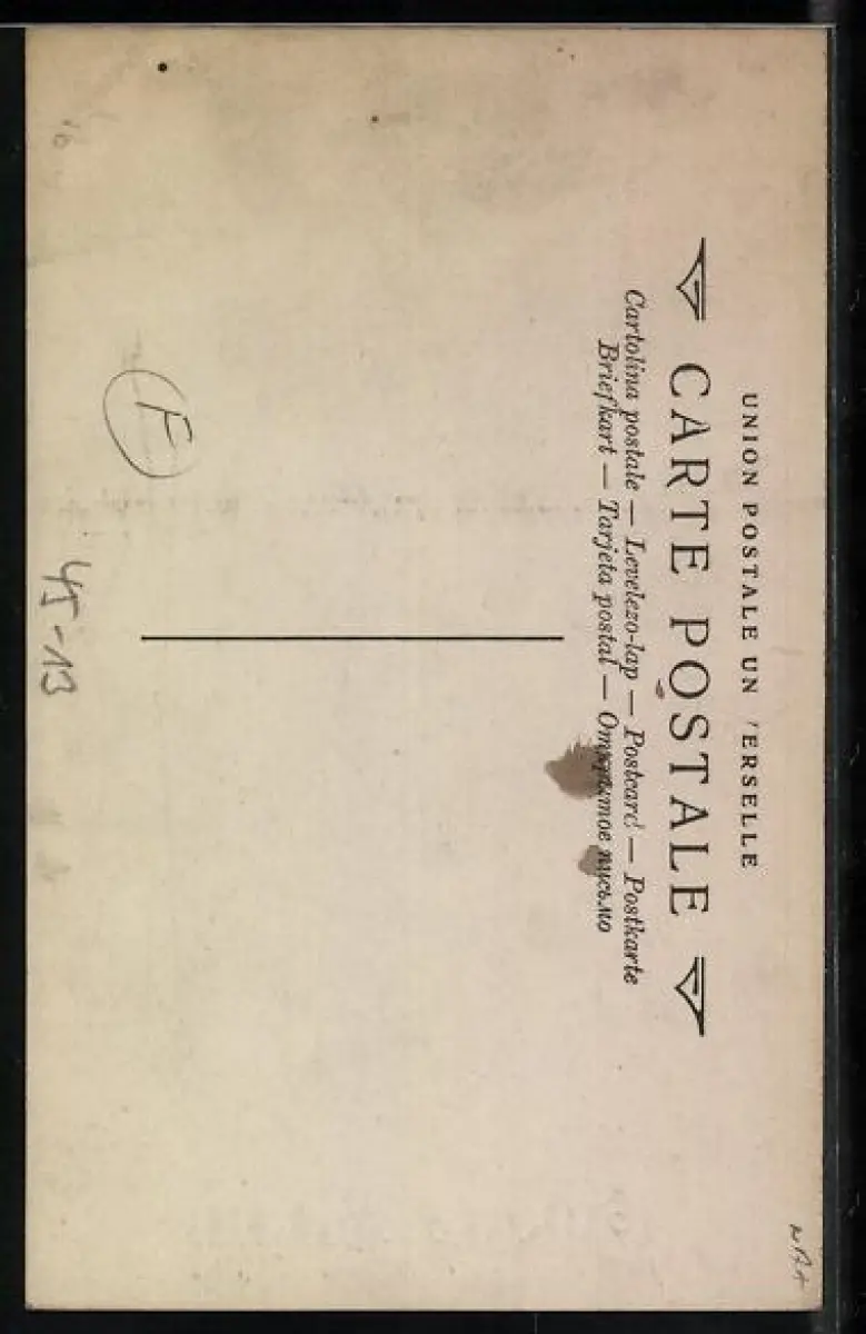 Personenbezogene Daten auf der Rückseite der Karte wurden durch blauen Textmarker unkenntlich gemacht. Die blauen Stellen sind auf die Vorderseite durchgeweicht und wirken sich negativ auf das Postkartenfoto aus