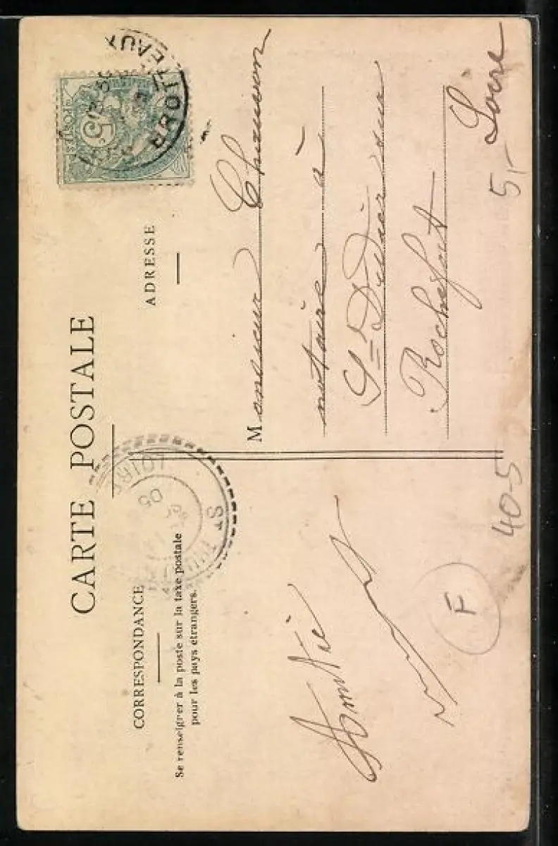 Personenbezogene Daten auf der Rückseite der Karte wurden durch blauen Textmarker unkenntlich gemacht. Die blauen Stellen sind auf die Vorderseite durchgeweicht und wirken sich negativ auf das Postkartenfoto aus
