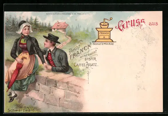 AK Paar in Schwarzwälder Tracht mit Reklame für Aecht Franck Caffee-Zusatz
