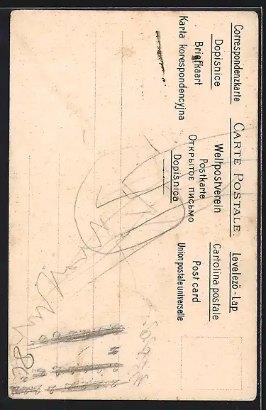 Personenbezogene Daten auf der Rückseite der Karte wurden durch blauen Textmarker unkenntlich gemacht. Die blauen Stellen sind auf die Vorderseite durchgeweicht und wirken sich negativ auf das Postkartenfoto aus