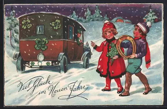 AK Paar mit Hufeisen, Auto auf verschneiter Strasse