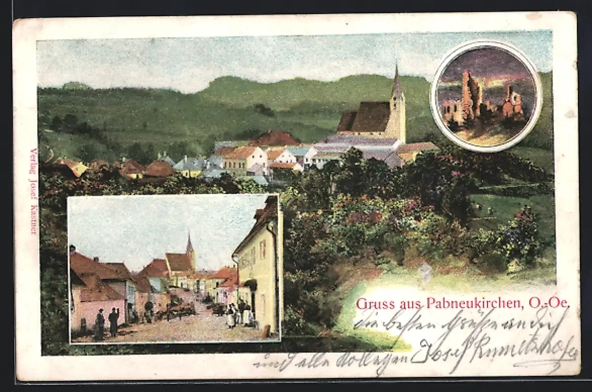 AK Pabneukirchen /O.-Oe., Strassenpartie mit Blick zur Kirche, Ruine