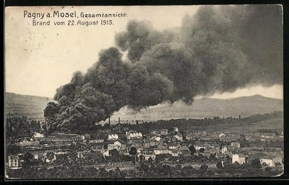 AK Pagny a. Mosel, Gesamtansicht, Brand vom 22.08. 1915