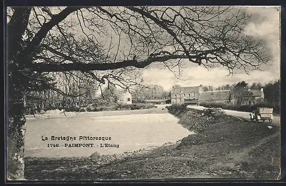 AK Paimpont, L`Étang pittoresque avec vue sur la route et les maisons rurales
