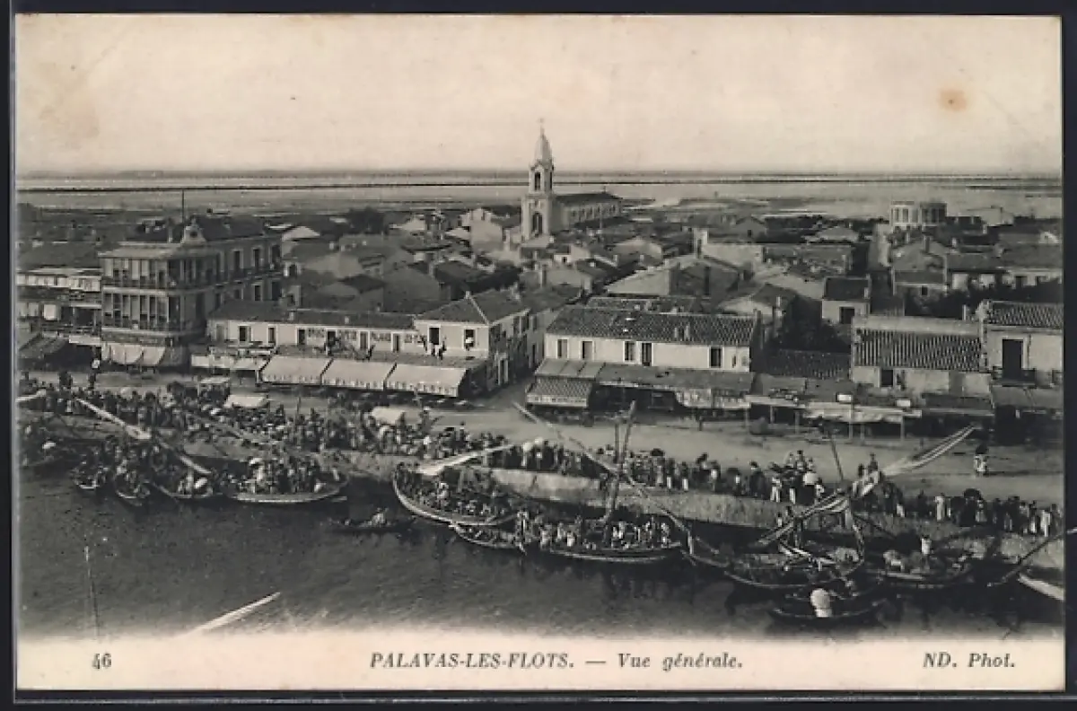 AK Palavas-les-Flots, Vue générale du village avec église et quai animé
