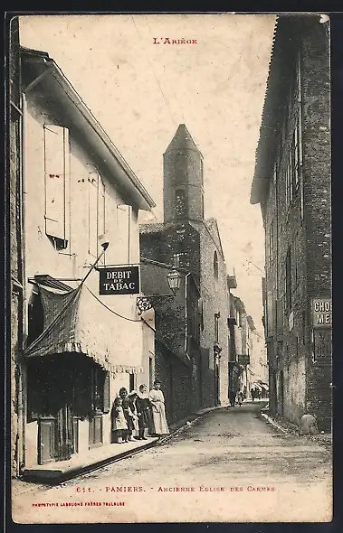 AK Pamiers, Ancienne Église des Carmes et rue animée avec débit de tabac