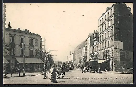AK Pantin, Rue des Petits-Ponts avec charrettes et passants