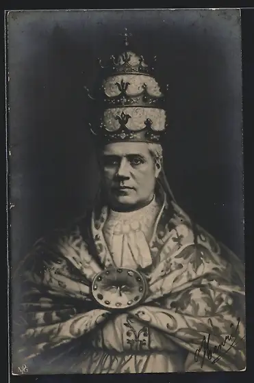 AK Papst Pius X. mit Papstkrone und gemustertem Gewand mit Friedenstauben-Brosche