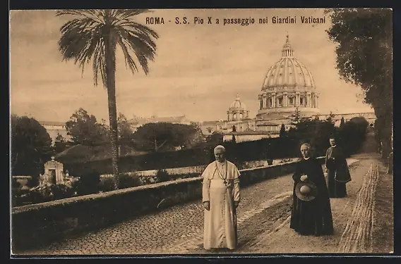AK Papst Pius X. mit zwei weiteren Heiligen in den vatikanischen Gärten