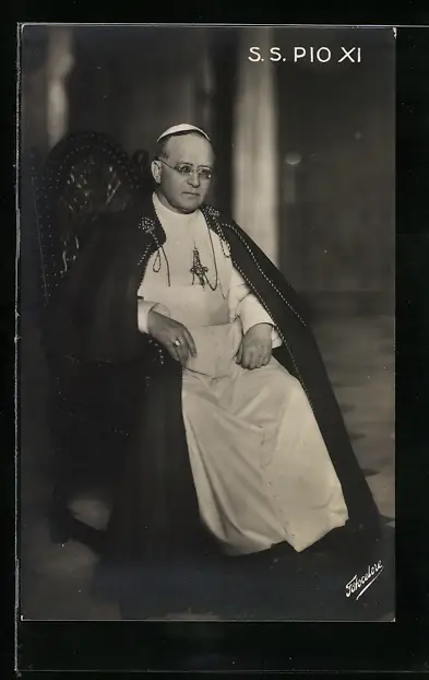 AK Papst Pius XI. mit ernstem Blick auf dem heiligen Stuhl sitzend