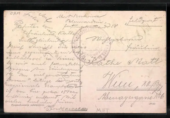 Personenbezogene Daten auf der Rückseite der Karte wurden durch blauen Textmarker unkenntlich gemacht. Die blauen Stellen sind auf die Vorderseite durchgeweicht und wirken sich negativ auf das Postkartenfoto aus