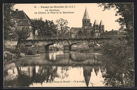 AK Paray-le-Monial, La Basilique, Le Cloitre, le Pont et la Bourbince