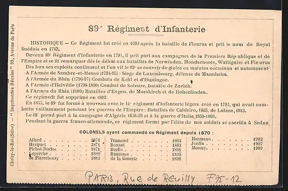 AK Paris, 89e Régiment d`Infanterie, La Caserne, Rue de Reuilly