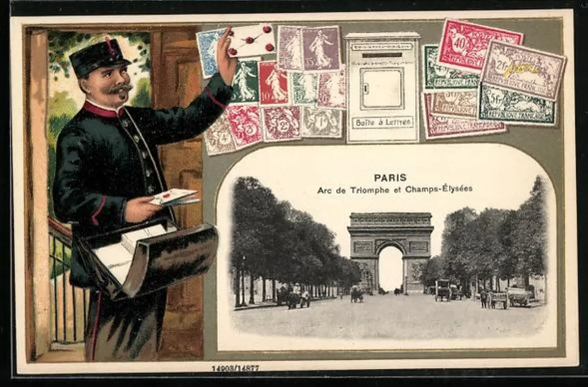 AK Paris, Arc de Triomphe et Champs-Elysées, Postboote, Briefkasten und Briefmarken