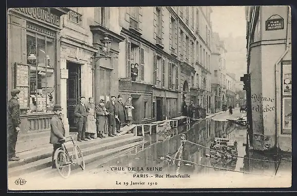 AK Paris, Crue de la Seine 1910, Rue Hautefeuille inondée et passants observant l`eau élevée